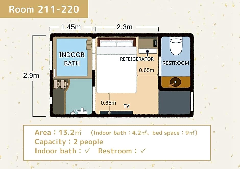 This double room's standout feature is the hot tub. The double room includes a private bathroom, well-fitted with a bath, a shower, a bidet, a hairdryer and slippers. This double room is air-conditioned and features a flat-screen TV with cable channels, yukata and heating. The unit offers 1 bed.